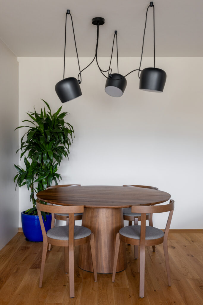 The apartment of± 70 m² is divided into a light-flooded open living space which includes the kitchen, living room, dining area and access to a terrace. The white kitchen can be completely closed off from floor to ceiling with sliding wooden doors. A minimalistic built-in storage wall in the living space increases storage capacity and divides the living space from the rest of the apartment. The remaining rooms include a children’s bedroom with a separate bathroom, a master bedroom with an ensuite bathroom and access to another terrace.